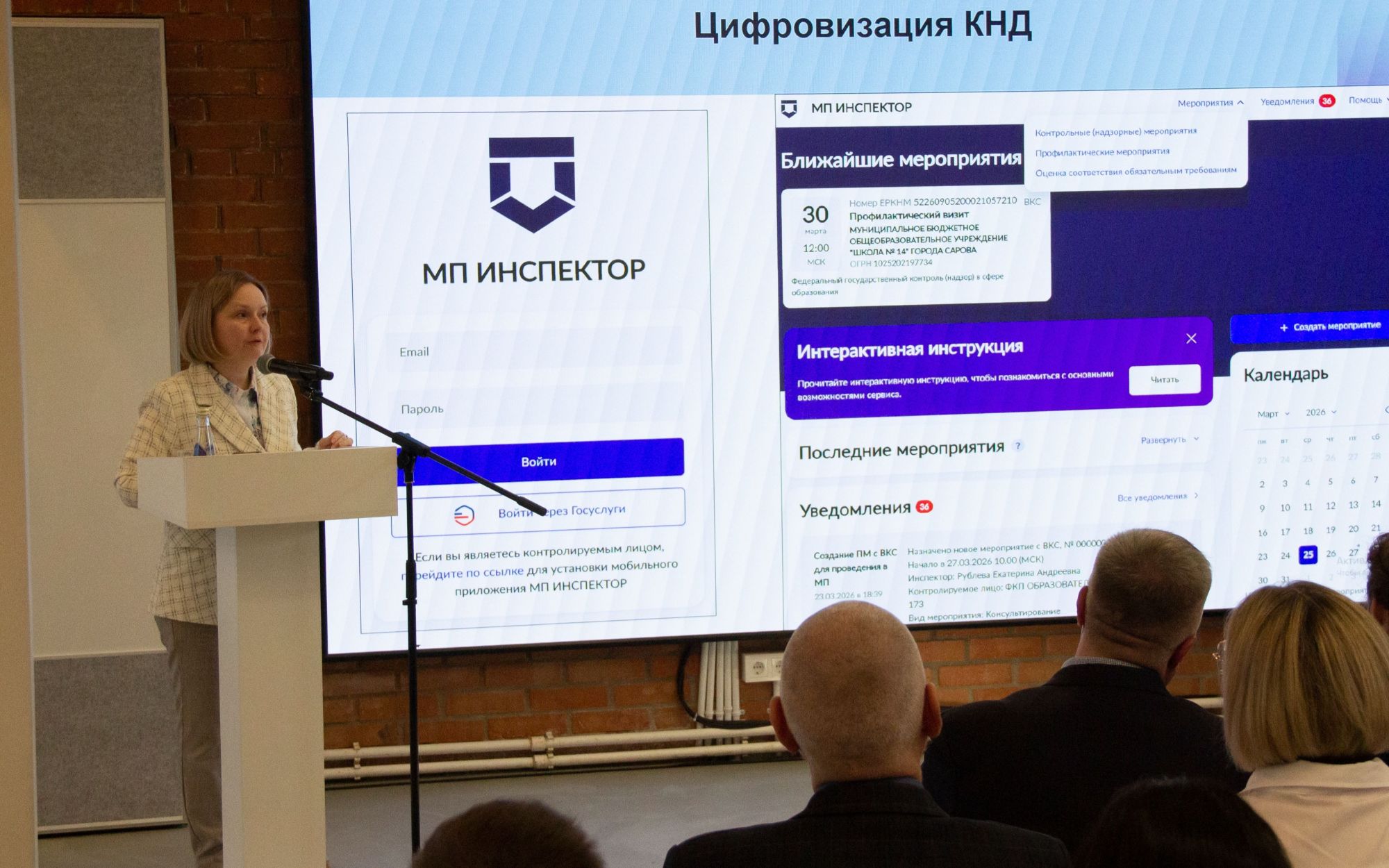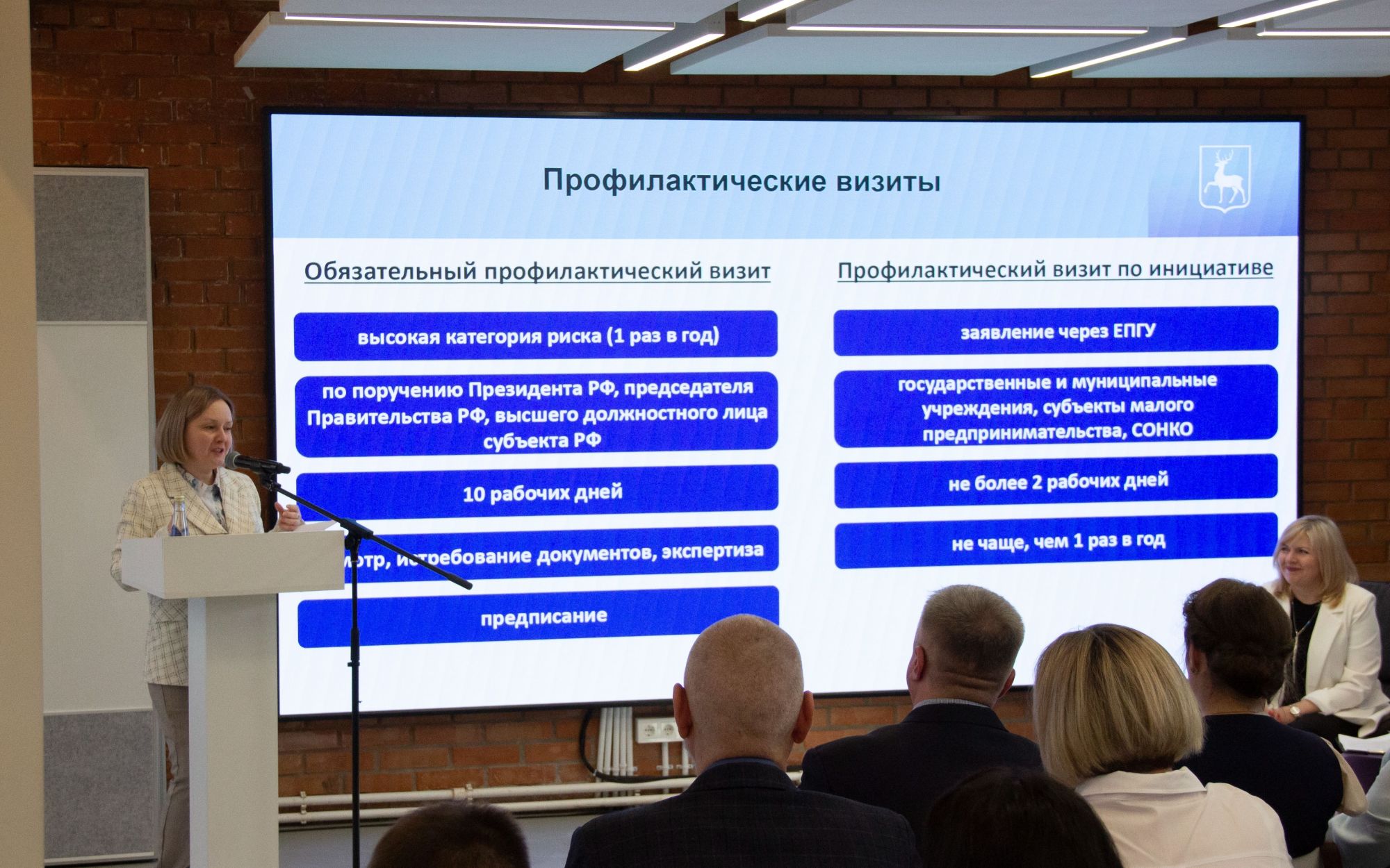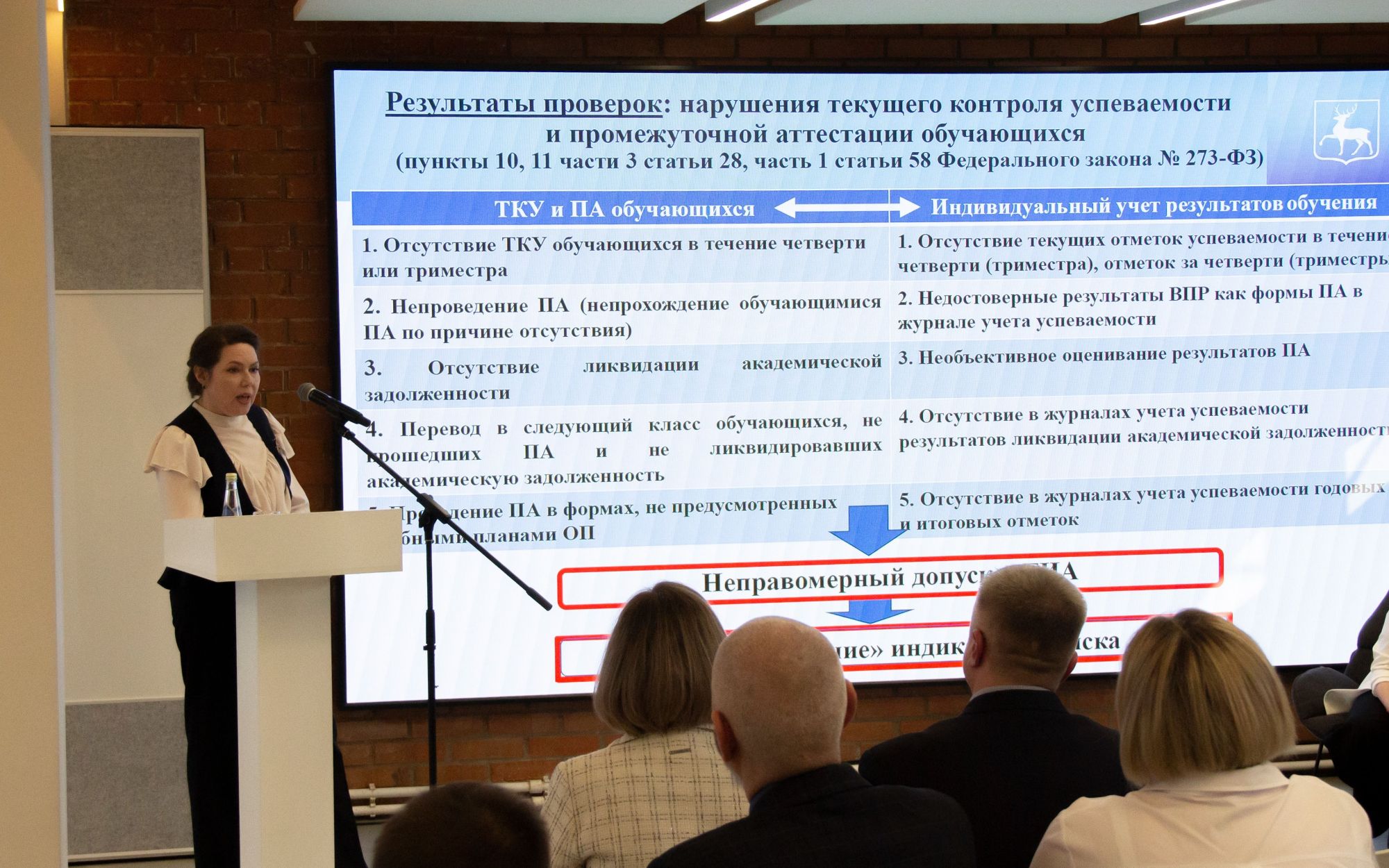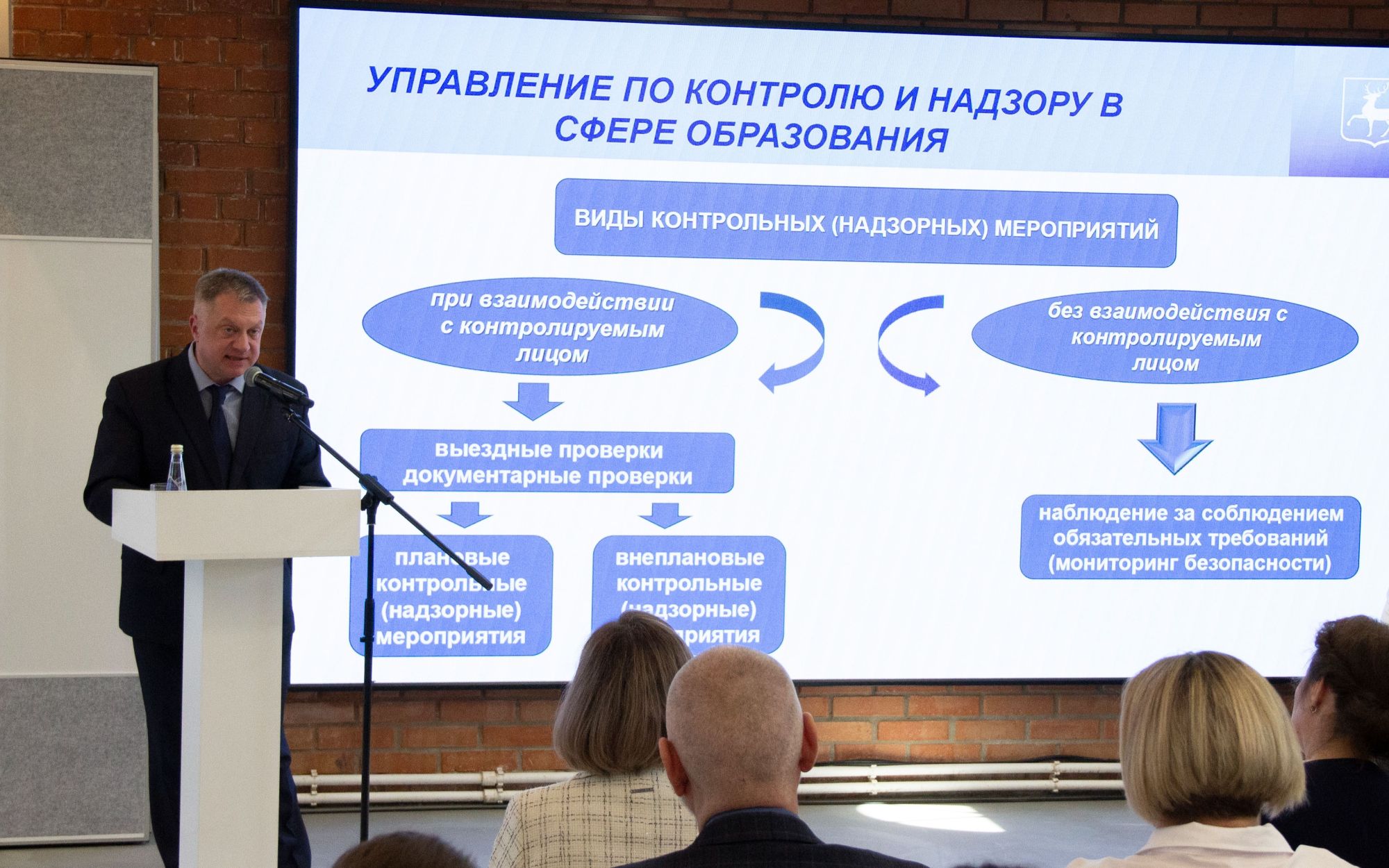 С докладами выступили Павлова Надежда Владимировна, начальник управления по контролю и надзору в сфере образования, Логунова Татьяна Вячеславовна, заместитель начальника управления по контролю и надзору в сфере образования, Коновалов Сергей Иванович, начальник отдела государственного контроля (надзора), Рублева Екатерина Андреевна, начальник отдела правового регулирования и профилактики нарушений.